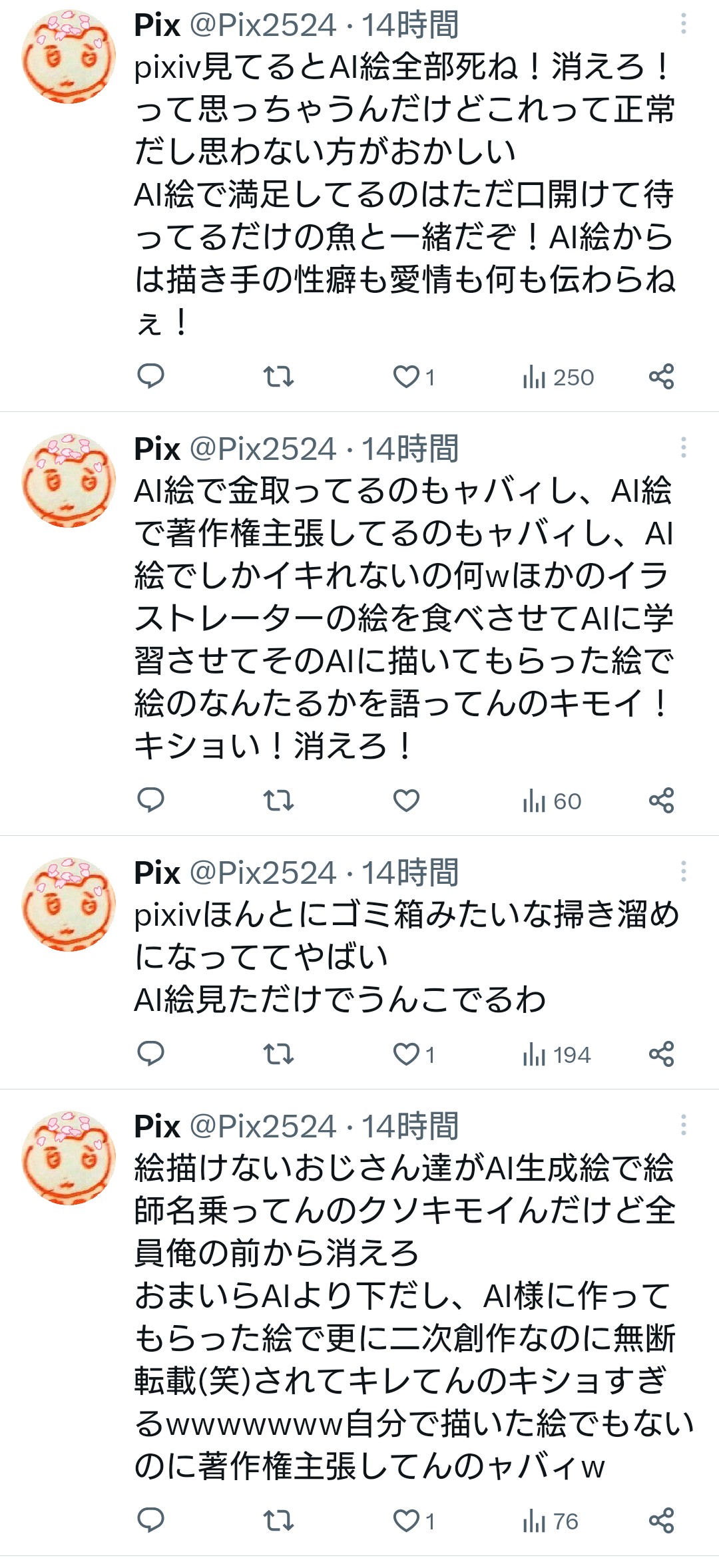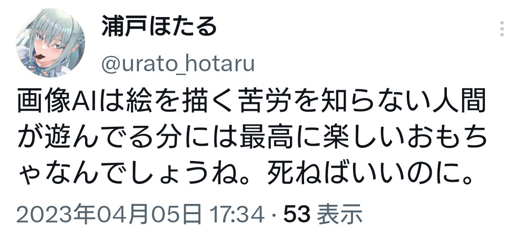 AIが悪いとは思わないけど、AIに書かせた絵をさも自分の作品のようにアップするアホは死に絶えていいと思う