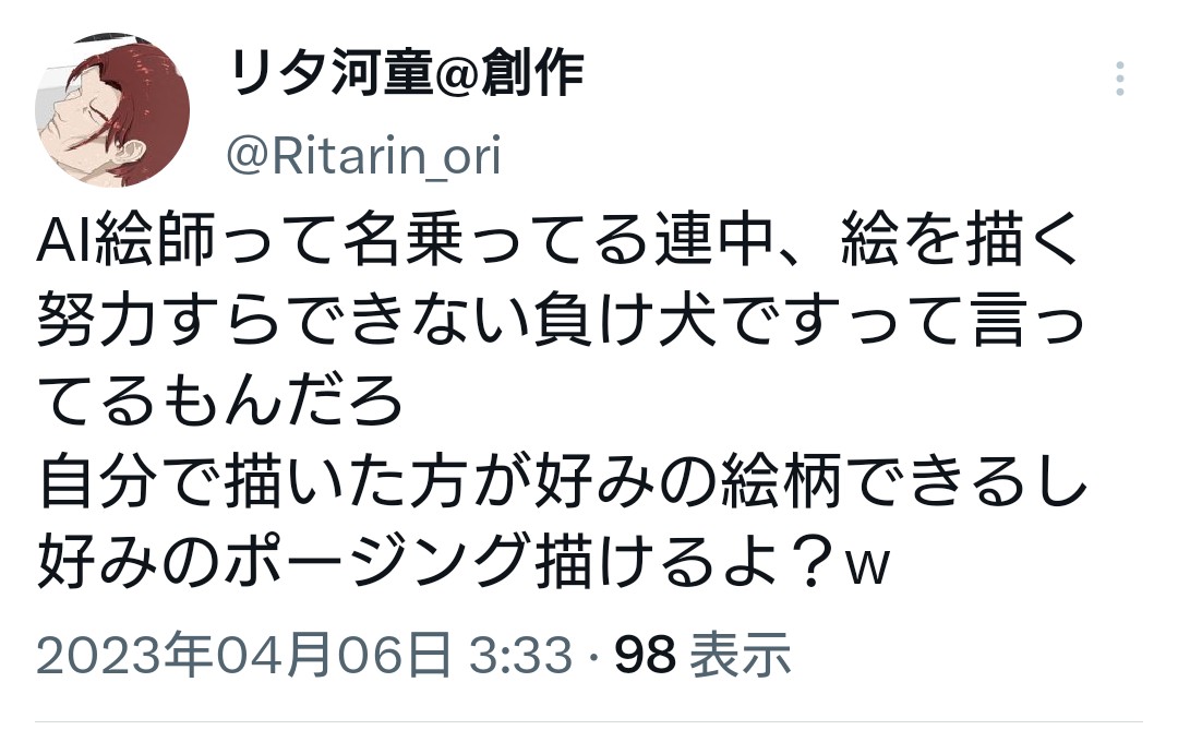 ただ、こうやって無駄に煽ってるのとか、もう絵描きいらないとか言ってるのはどうかと思うけど。