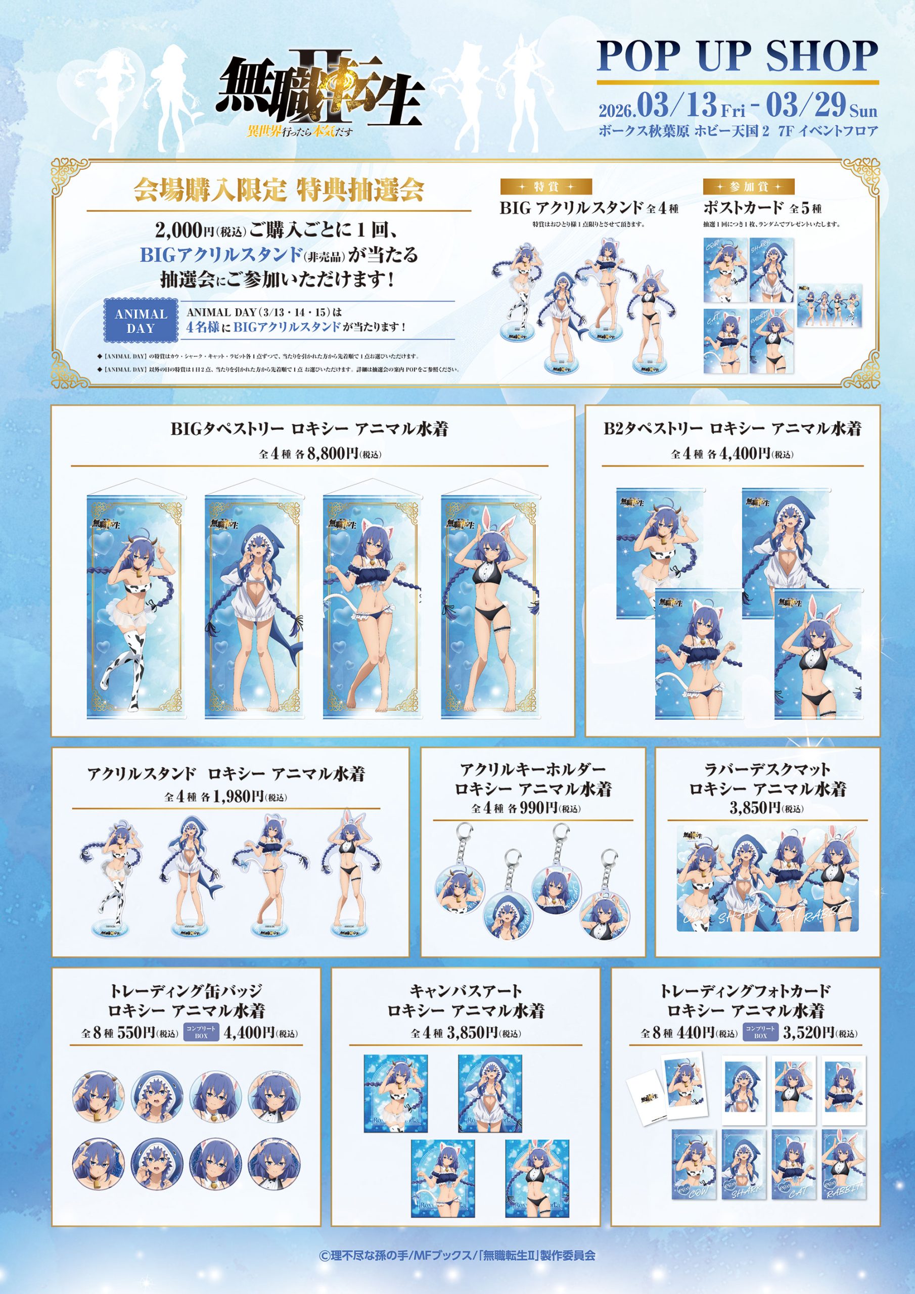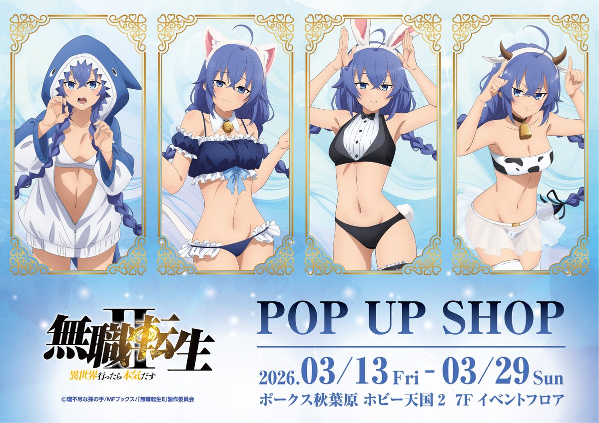 @hjb_new // TVアニメ 『#無職転生Ⅱ ~異世界行ったら本気だす~』 POP UP SHOP 開催決定 \\ 描き下ろしイラストを使用したアイテムが勢揃い‼ アニマル水着に身を包んだロキシーが登場です💙 https://twitter.com/hjb_new/status/2029852887606841719?s=46&t=Kq79bt5g6YpYJHqz-lJ_Ng ![]() ![]()