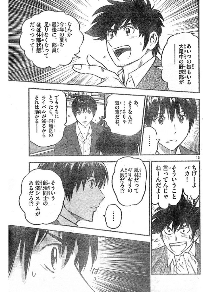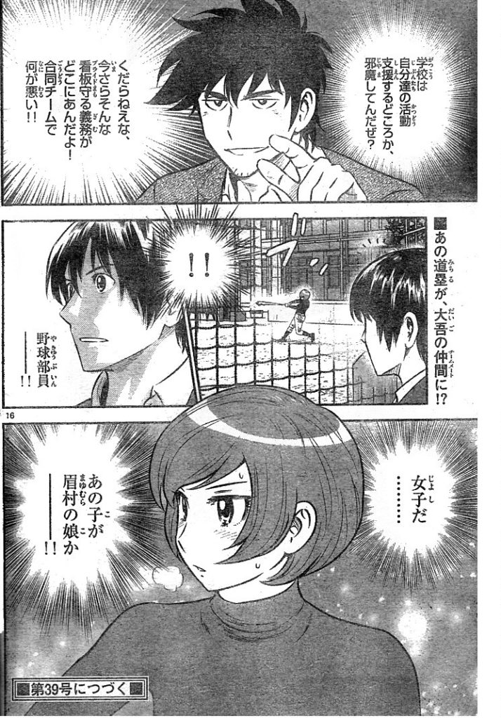 205話 練習場を探せ 表紙は水着の睦子 テニスコート一面分程度の練習場所は何とか確保できたものの みんな気落ちしているだろうとグラウンドにいくと普通にアップしていた しかし不安そうなメンバーを励ましあと1ヶ月の間に練習グラウンドを何とかすると約束する寿也 寿也は四国から再び吾郎を呼び寄せグラウンドの件を相談する 俺とお前ででかい土地を買い上げるかなどと話をしているうちに 眉村から、大尾中が今年の夏を最後に部員不足で休部状態だと聞いていた吾郎が 風林と大尾で合同チームを作れば大尾のグラウンドで練習ができると提案する 寿也が大尾中のグラウンドに行くと そこには素振りをする道塁の姿があった つづく